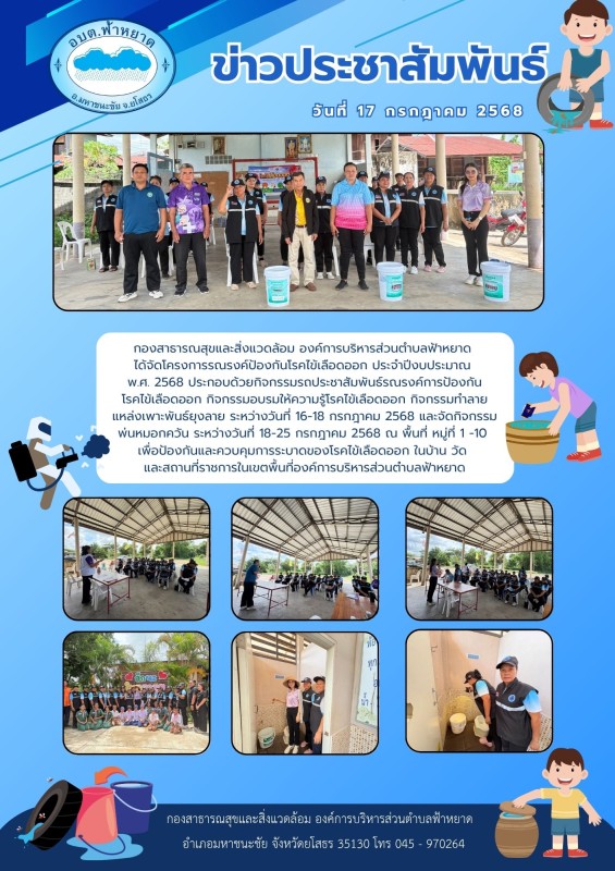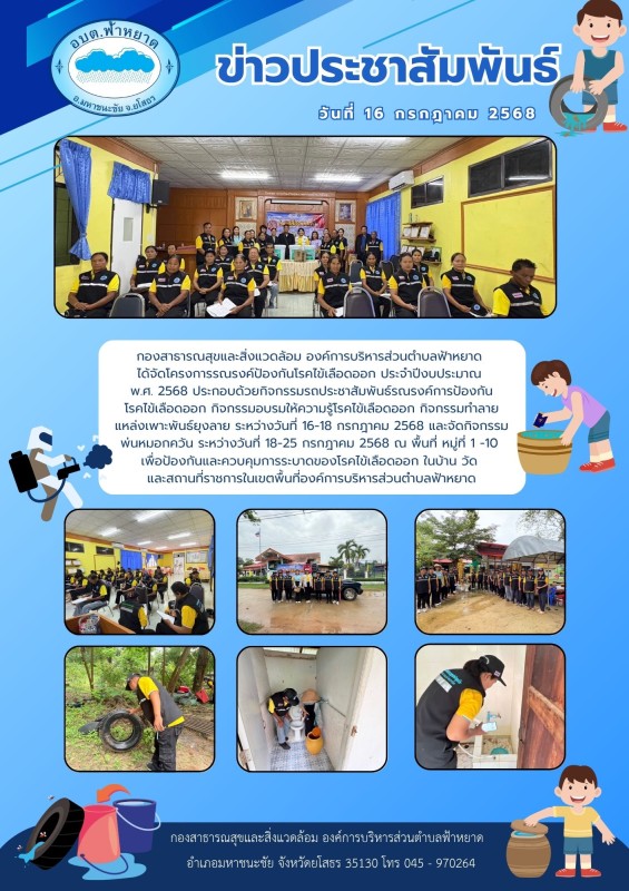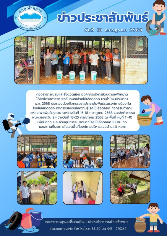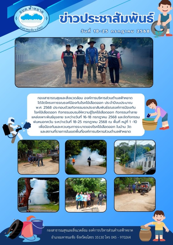 กองสาธารณสุขและสิ่งแวดล้อม องค์การบริหารส่วนตำบลฟ้าหยาด ได้จัดโครงการรณรงค์ป้องกันโรคไข้เลือดออก ประจำปีงบประมาณ พ.ศ. 2568 ประกอบด้วยกิจกรรมรถประชาสัมพันธ์รณรงค์การป้องกันโรคไข้เลือดออก กิจกรรมอบรมให้ความรู้โรคไข้เลือดออก กิจกรรมทำลายแหล่งเพาะพันธ์ยุงลาย ระหว่างวันที่ 16-18 กรกฎาคม 2568 และจัดกิจกรรมพ่นหมอกควัน ระหว่างวันที่ 18-25 กรกฎาคม 2568 ณ พื้นที่ หมู่ที่ 1 -10 เพื่อป้องกันและควบคุมการระบาดของโรคไข้เลือดออก ในบ้าน วัด และสถานที่ราชการในเขตพื้นที่องค์การบริหารส่วนตำบลฟ้าหยาด