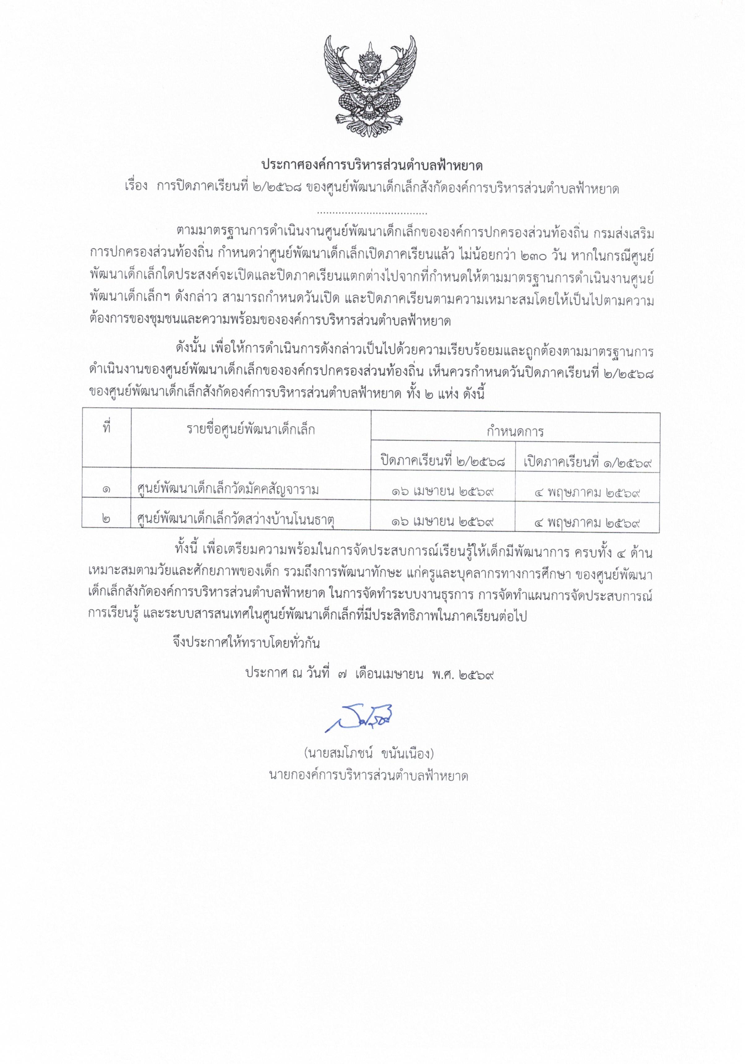 เรื่อง การปิดภาคเรียนที่ 2/2568 ของศูนย์พัฒนาเด็กเล็กในสังกัด